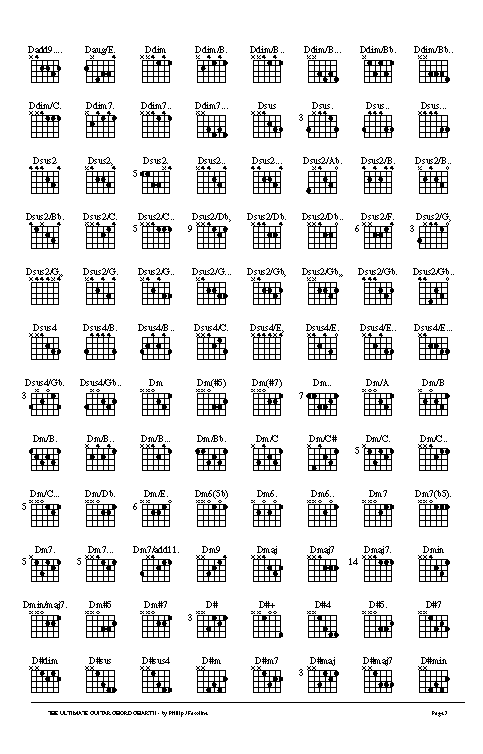 Over 1200 guitar chord positions! Click on the page number below to view the respective page of the chord chart. Click here to view the chord chart in PDF format. Click here to download the chord chart in Postscript format.
