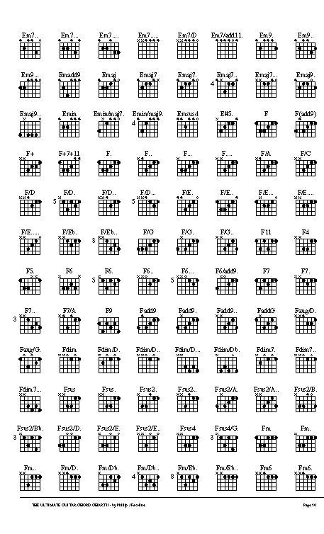 Over 1200 guitar chord positions! Click on the page number below to view the respective page of the chord chart. Click here to view the chord chart in PDF format. Click here to download the chord chart in Postscript format.