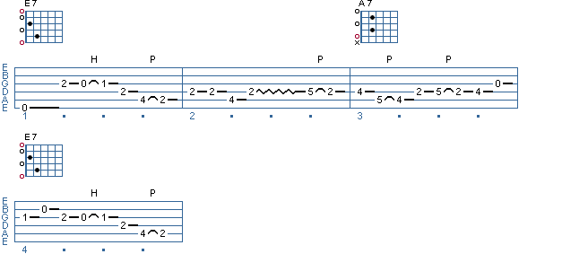 One of the reasons why this lick sounds so great is that it completely reflects the chord changes from E7 to A7 and back to E7. Each time we're on the E7, we hammer the open G string to G#, which is the major 3rd of the E7. This gives the line a very strong E major feeling at the start, and again when we return in measure 4. The pull-off from the D to the C# in measure 2 implies the A chord really strongly as well.